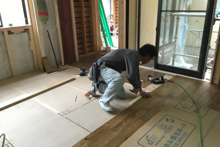 火曜日に現場監理・打合せに行ってきました。 引き続き大工工事が進行中です。 フローリングを貼り始めました。 無垢のフローリングで、樹種はクリです。 表面にブラウ……