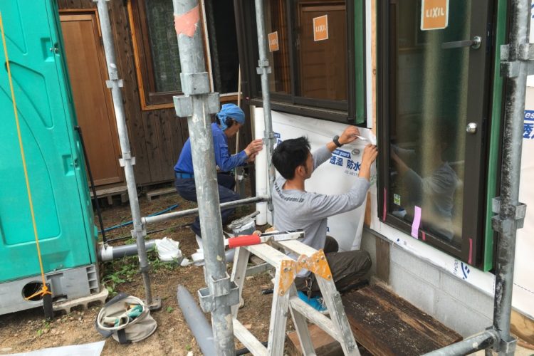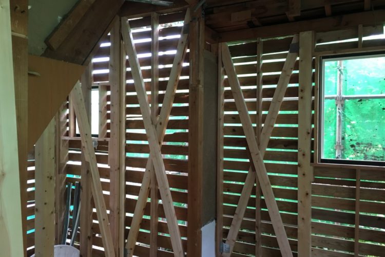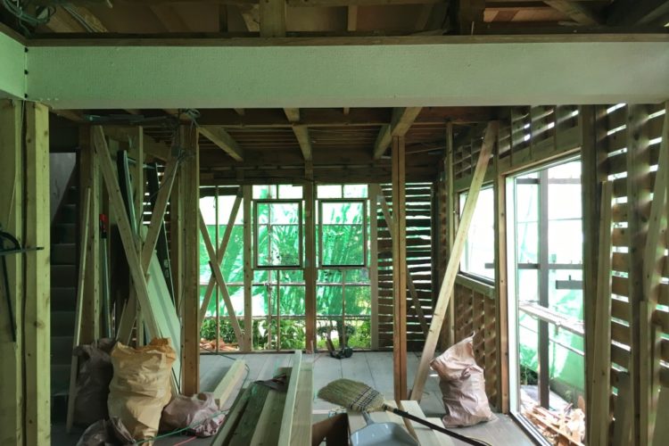引き続き大工工事が進行中です。 筋かい設置、柱補強、サッシ枠の設置等を行っていきます。 本日は現場にて、補強の方法等を吉岡木材さんと堂本棟梁と打合せました! ……