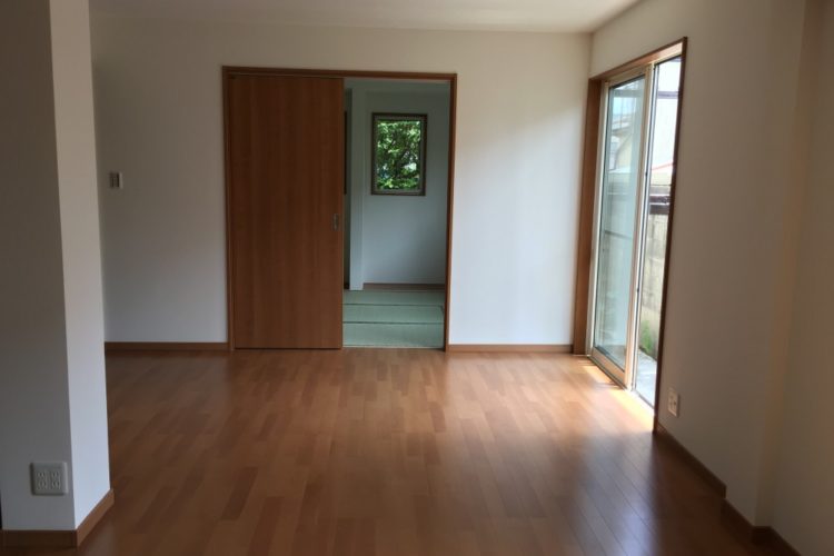 改修工事が完了しました! 養生を撤去し、フローリングが現れました。 建具とフローリングの色味が揃っており、視覚的にスッキリ見えますね。 リビングから和室を見ると……