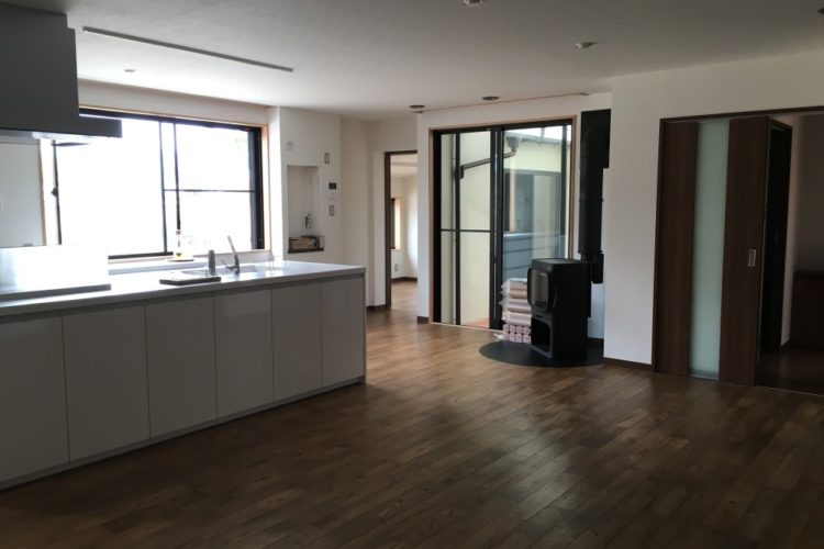 完成しました!! 少しですが写真をご覧ください。 < ダイニングキッチンです。 薪ストーブが角に鎮座しています。 薪ストーブはJØTUL(ヨツール)のF305……