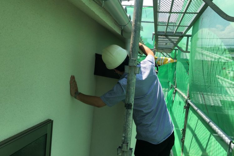 天候の関係で工程が思う様に進みませんでしたが、江端塗装さんが外壁の下塗り・中塗り・上塗りを行いました。 足場の養生シートの色が反射して緑色に見えますが、実際の色……