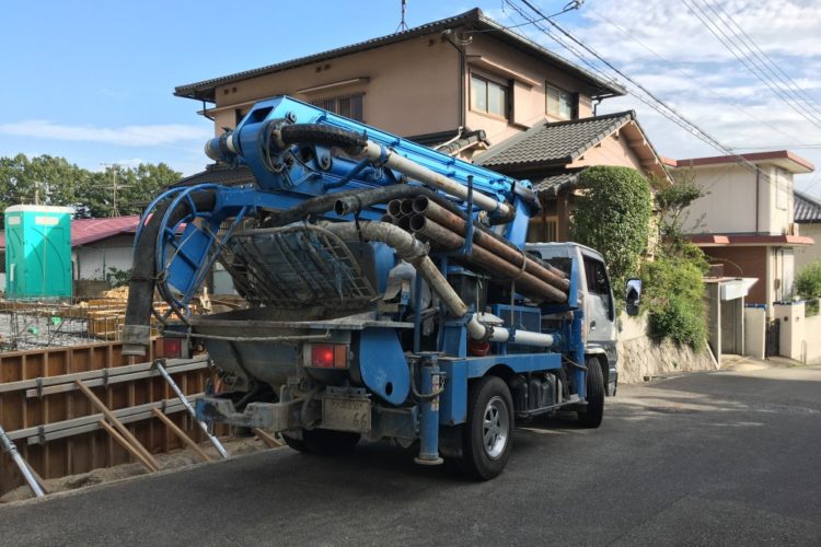 雨の日が続きますが、遅れること無く、工事は進んでおります。 工事は基礎工事の折り返し地点ぐらい、ベースコンクリート打設を行いました。 コンクリート打設ってどうや……