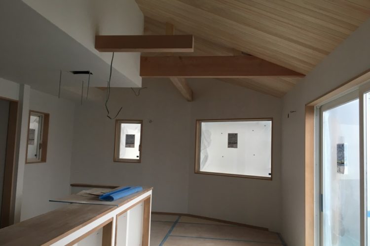 外壁のシーラーが施工されました。 下吹きの後、上吹き施工です。 LDKの壁紙は透湿クロスであるコバウを貼っています。 そのコバウにはフェザーフィールという透……