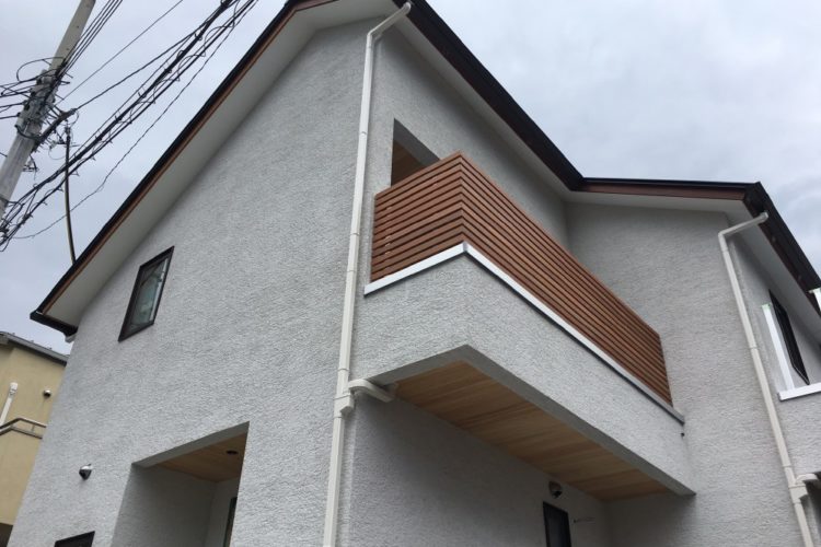 本日は、建築基準法の完了検査を受けました。 是正も無く、無事合格です! 外部足場が解体され、建物の外観が姿を現しました(^_^) バルコニーの木製格子が良い……