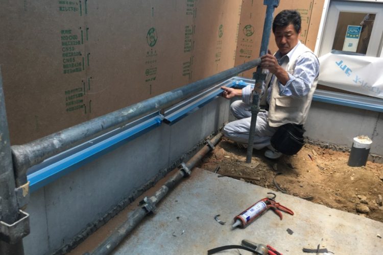 更新が遅くなりましたが、5月24日はサッシの取付け、土台水切りの施工、断熱・気密処理を行いました。 サッシの耳(内側)に窓用のパッキンを取付けます。 今……