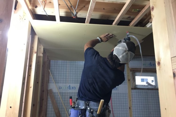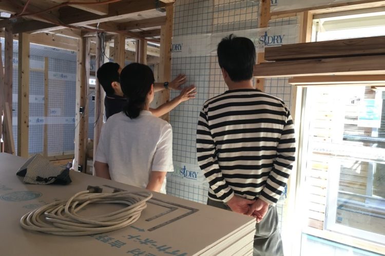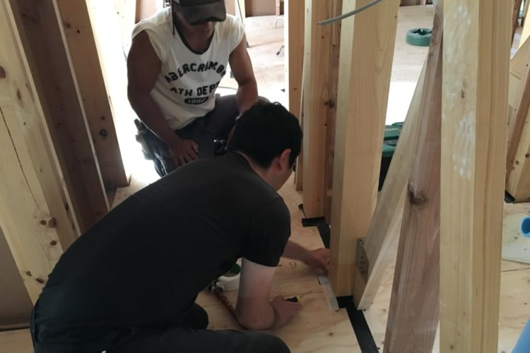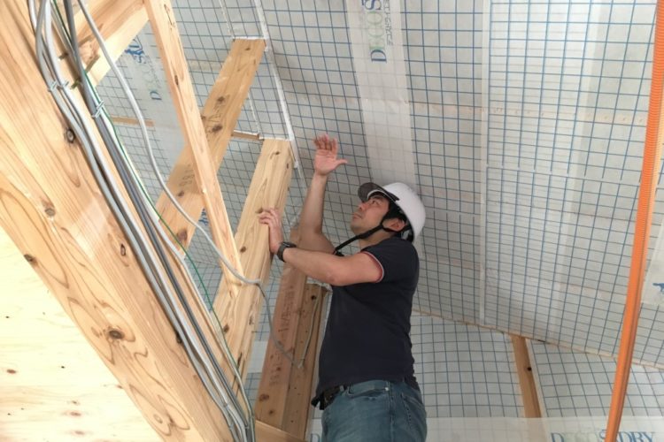 6月1日(木)に、現場監理と気密処理に行ってきました! 梶原組さんが外壁の透湿防水シートを施工し、堤棟梁が縦胴縁(通気胴縁)・左官下地のバラ板を施……