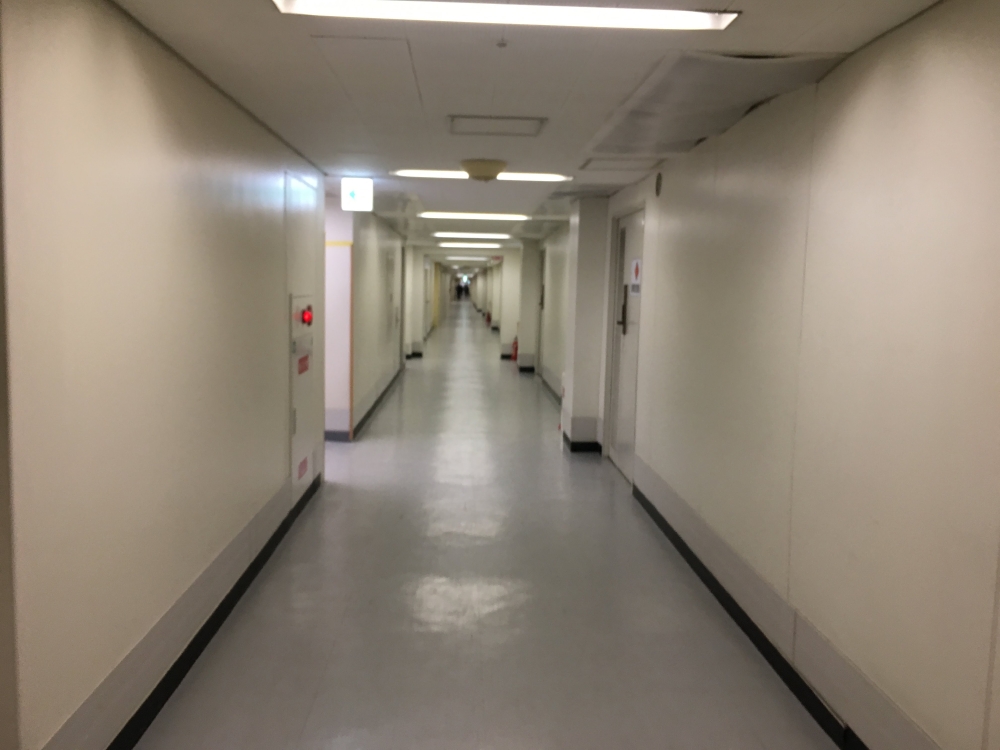 空港ビルの完全にバックヤード的な長い通路を歩きます。すれ違う人はCAさんやパイロット、警察官・・・。
