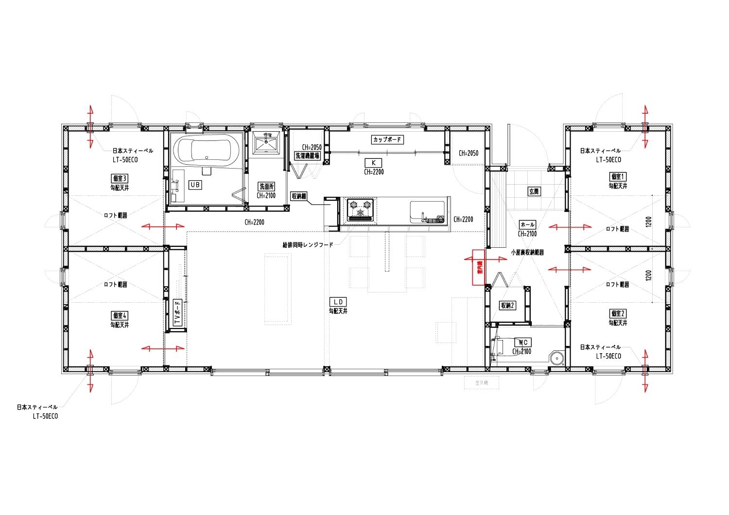 3、東西の個室に機器を設置し、LDKに設置したエアコン1台にて、家全体の空調をムラ無く行う為。