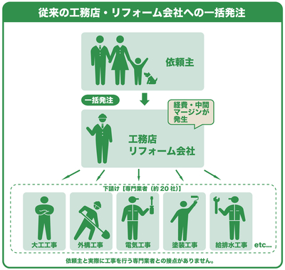 (工事の請負契約は依頼主と工務店・リフォーム会社との間でのみ締結されます)
