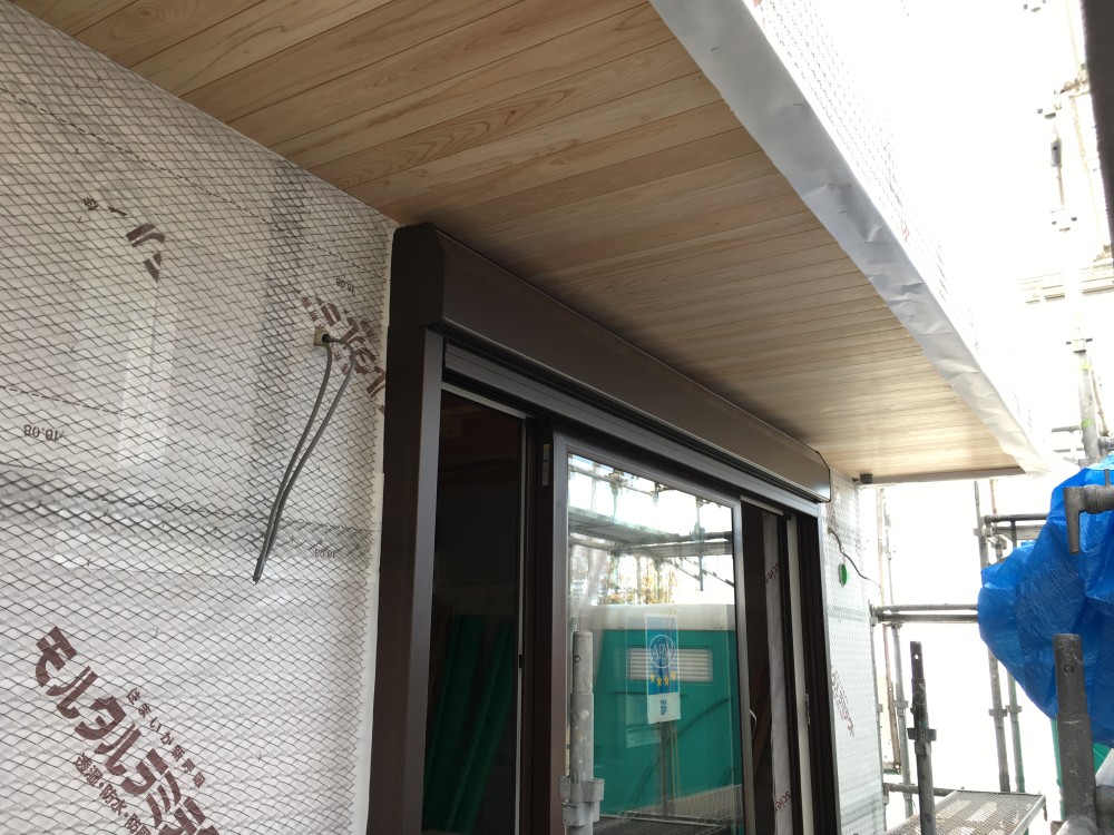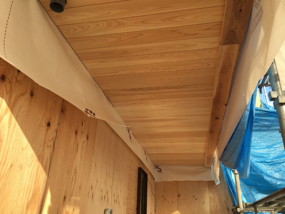 バルコニーの軒天にヒノキの羽目板が施工されました。