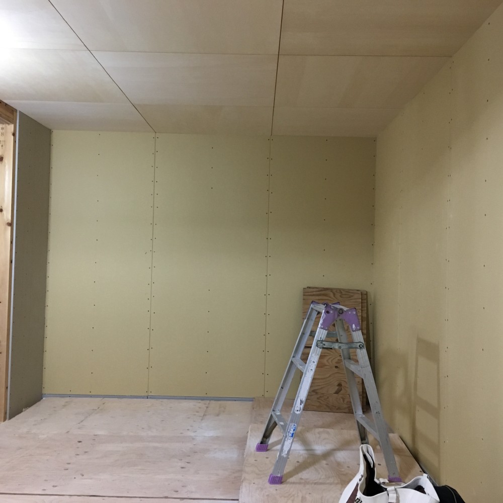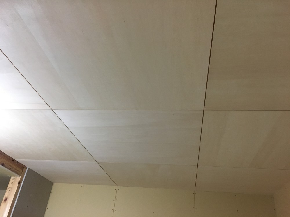 タタミ室の天井は、シナベニヤを市松状に張ります。
