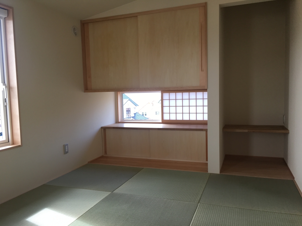 2階リビングに繋がる和室は天井高さを出来るだけ抑え、落ち着きのある空間と致しました!