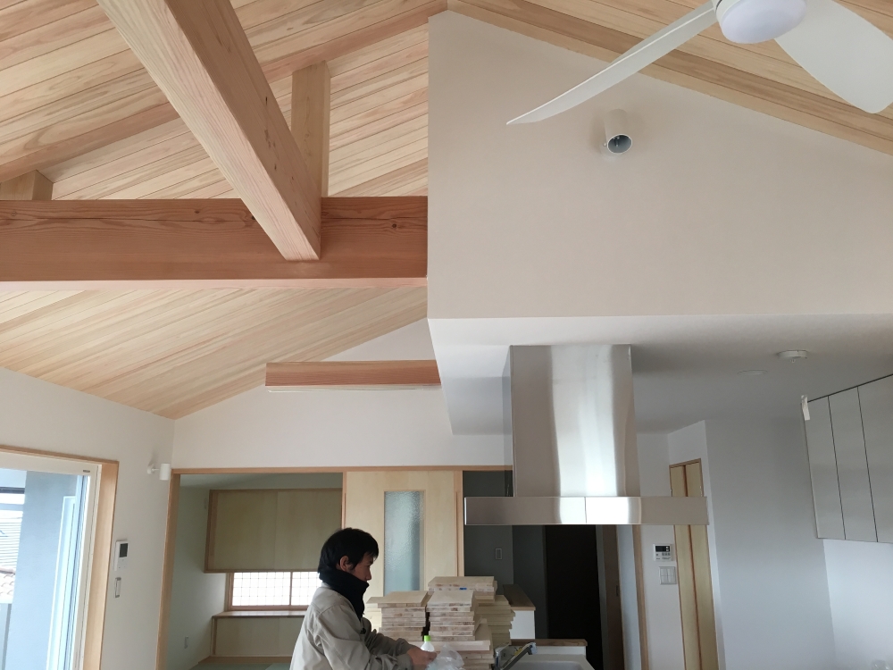 今回は屋根面・外壁・1階床面(基礎断熱では無く床断熱)はセルロースファイバー断熱(デコスドライ工法)を採用しています。