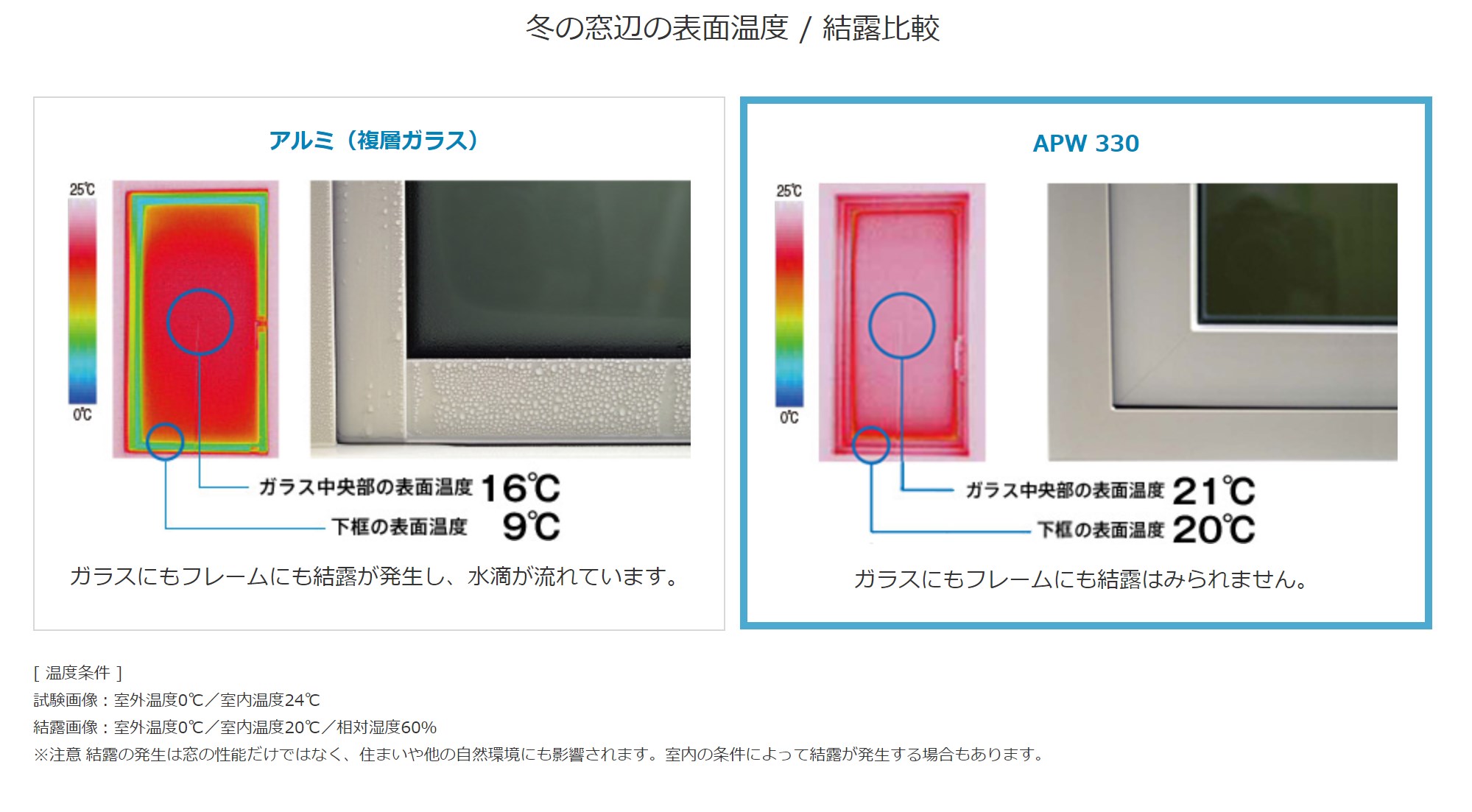 私の自邸のAPW330(Low-Eアルゴンペア・樹脂スペーサー)は、上記の温湿度状態になると、下枠に触れる部分のガラスが結露します。