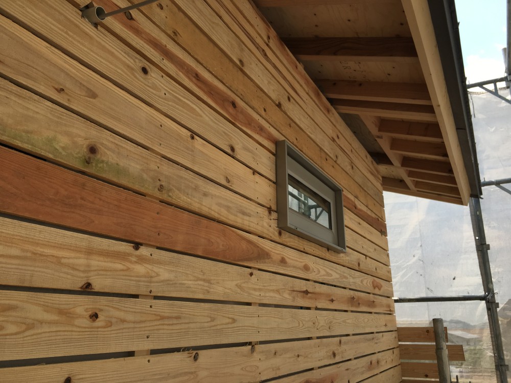 梶原組さんが外壁の透湿防水シートを施工し、堤棟梁が縦胴縁(通気胴縁)・左官下地のバラ板を施工していきます。