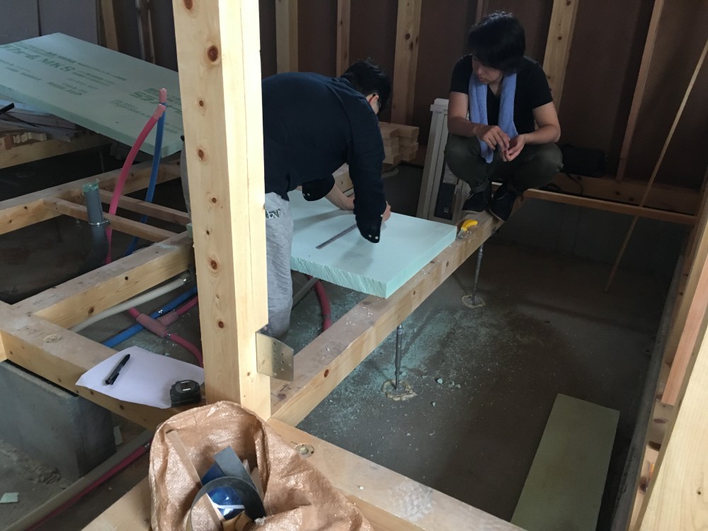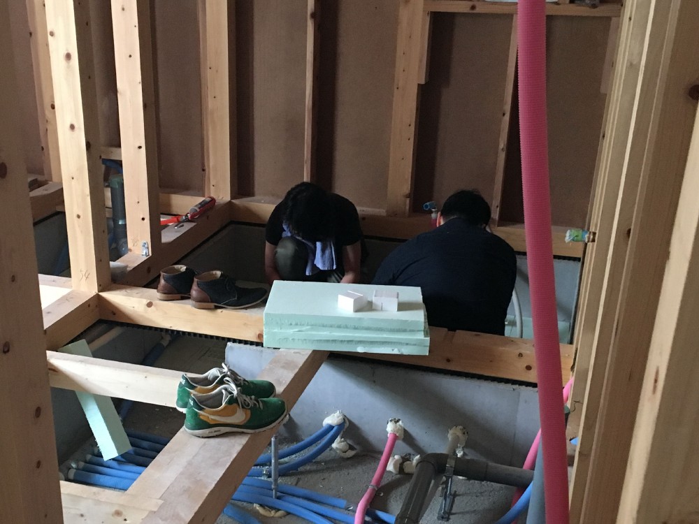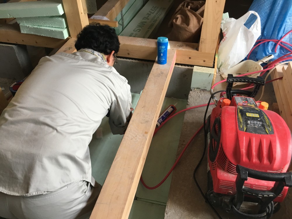 玄関ホールの一部、WC、UB部分は基礎断熱なので、断熱の施工と気密処理を行いました。