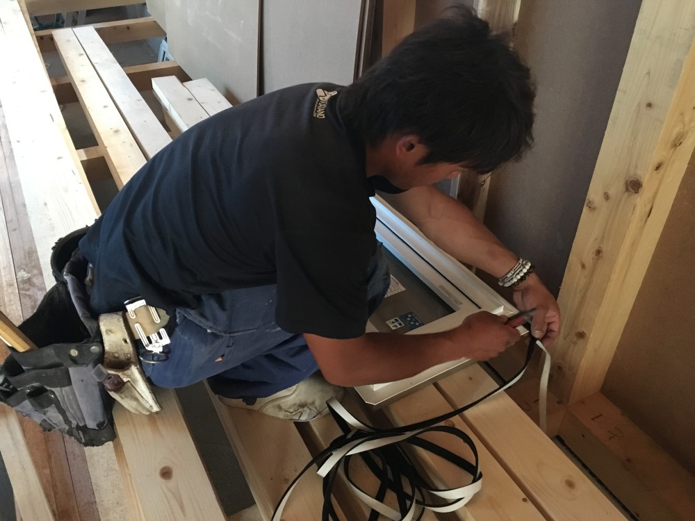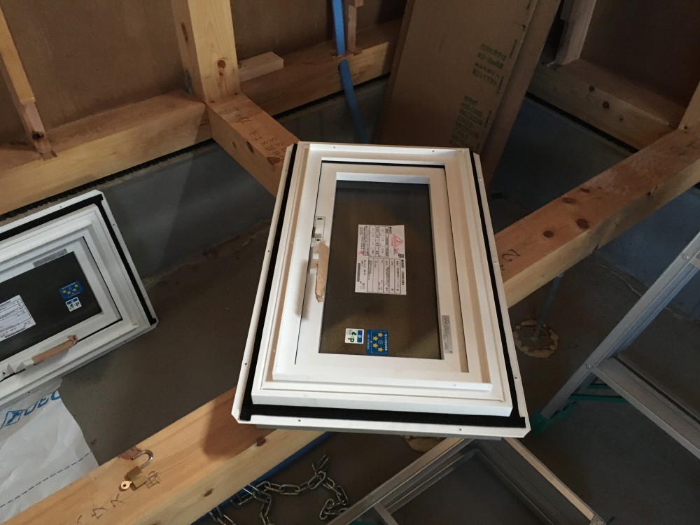 更新が遅くなりましたが、5月24日はサッシの取付け、土台水切りの施工、断熱・気密処理を行いました。