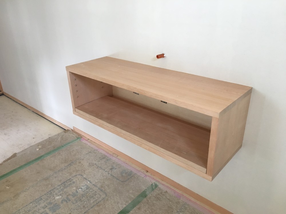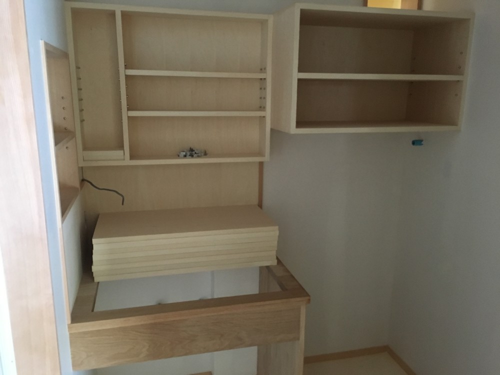 カウンターの下にも小さな棚板を設置しているので、ここにも小物等を置けます。