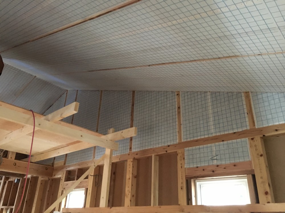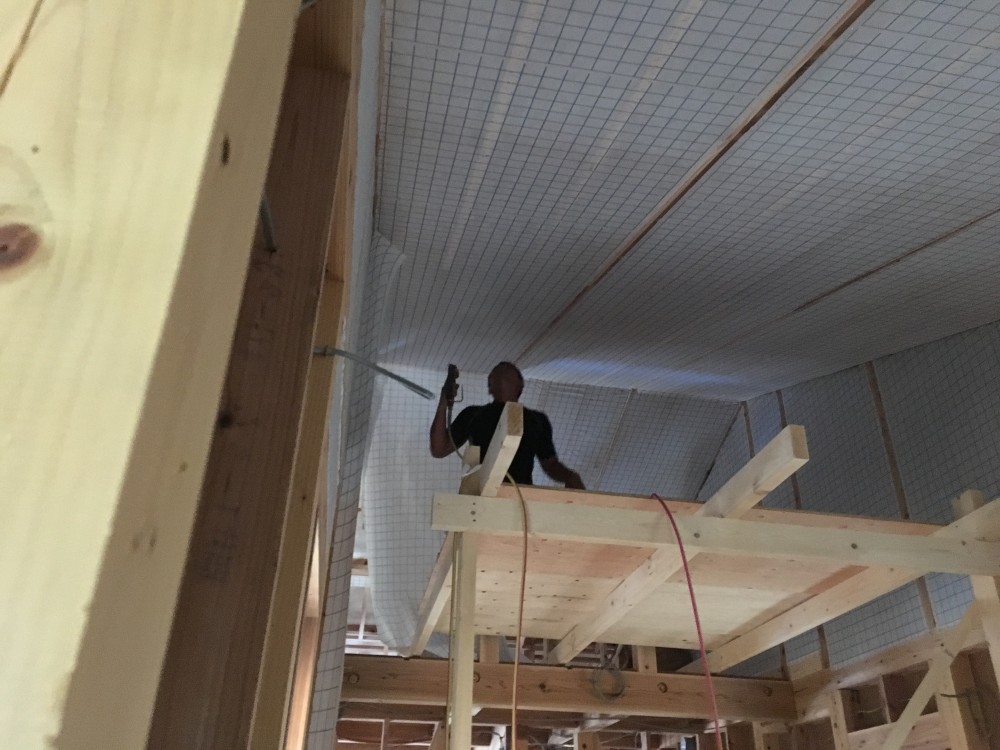 屋根・壁断熱の二層目の不織布を施工していきます。