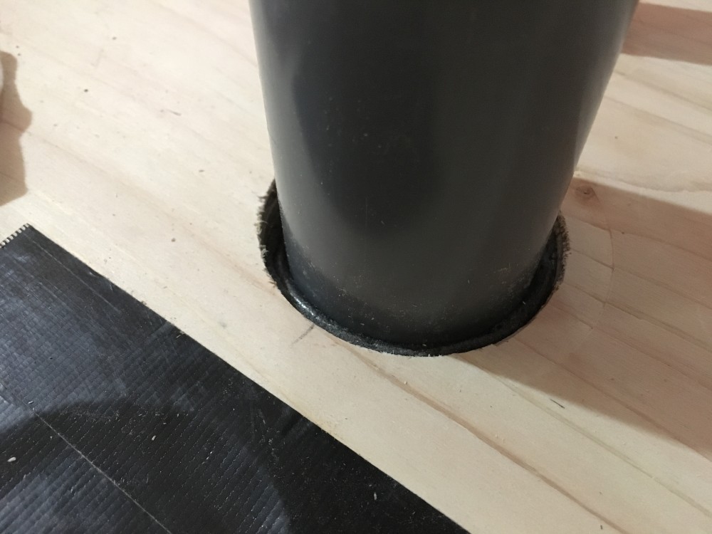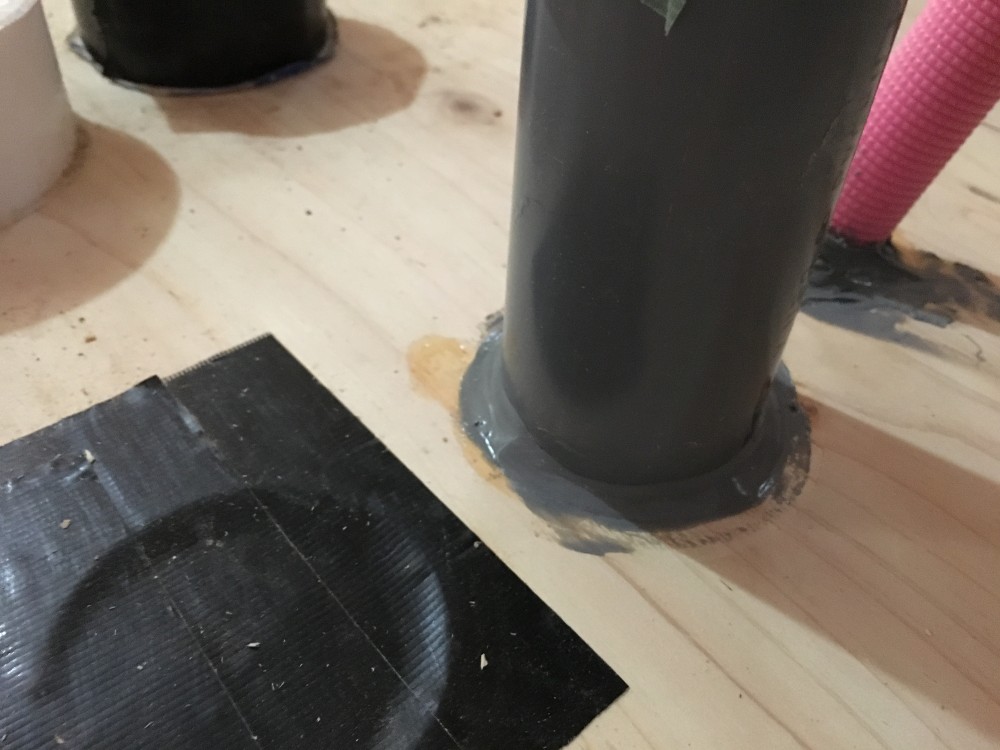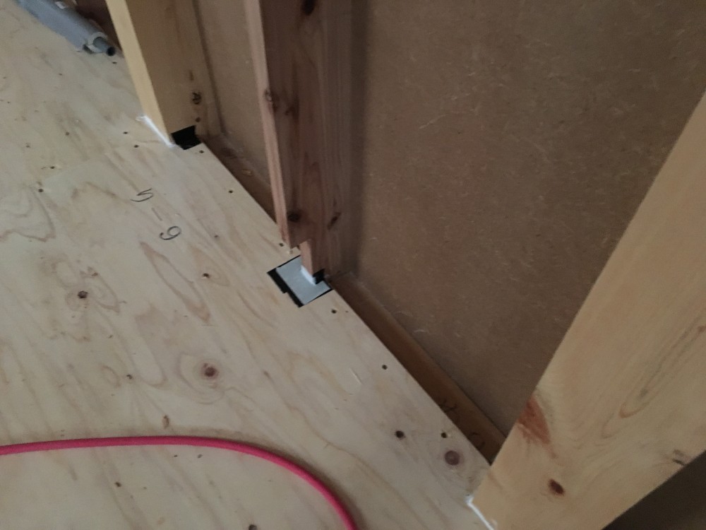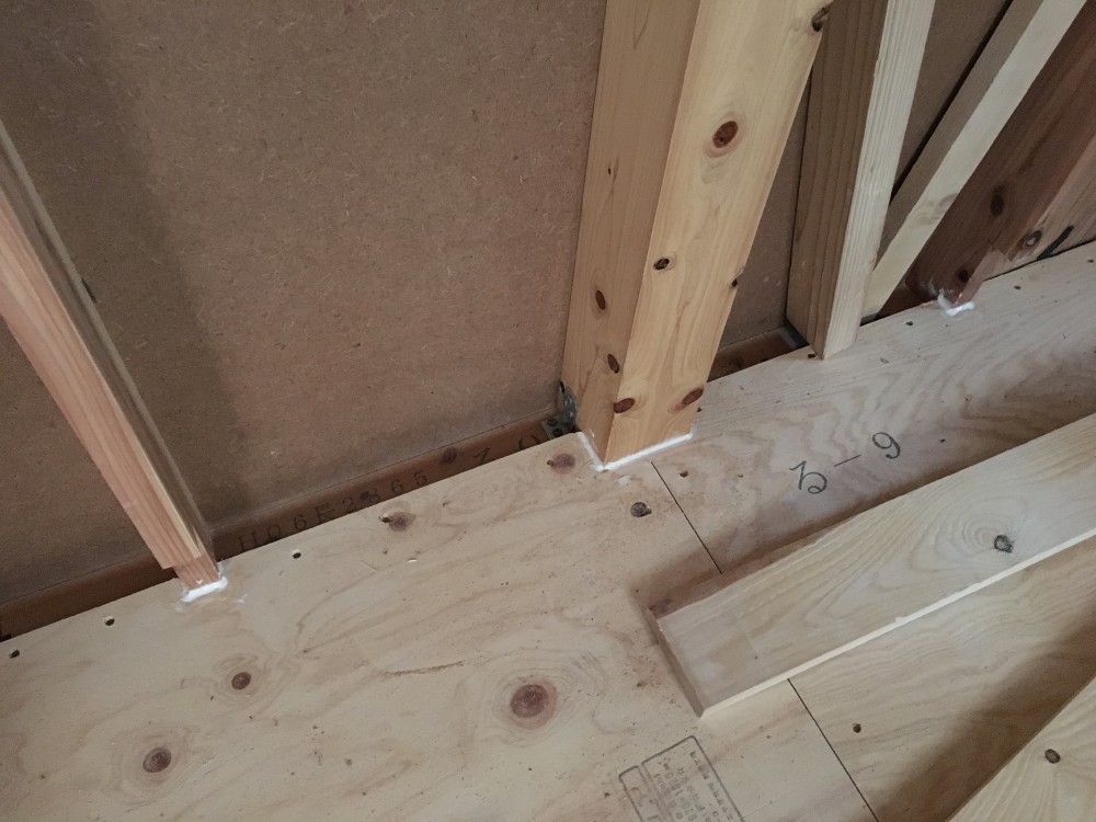 壁の断熱施工前に、外部に面する柱・間柱の足元を気密テープやコーキングで気密処理していきます。
