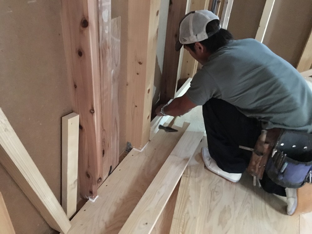 柱廻りの気密処理後、追っかけて巾木下地・断熱下地を施工していきます。