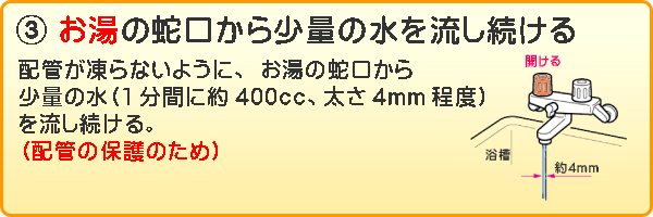 一番多いトラブルは給湯器です。お風呂にて給湯側から少しだけ水を出しておくことで配管損傷を防止出来ます。