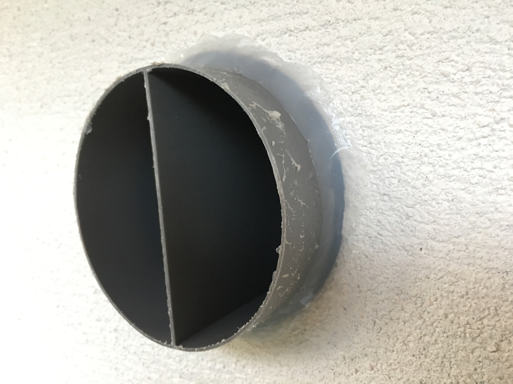 外部は仕切り板付きパイプと外壁の隙間にコーキングを行います。