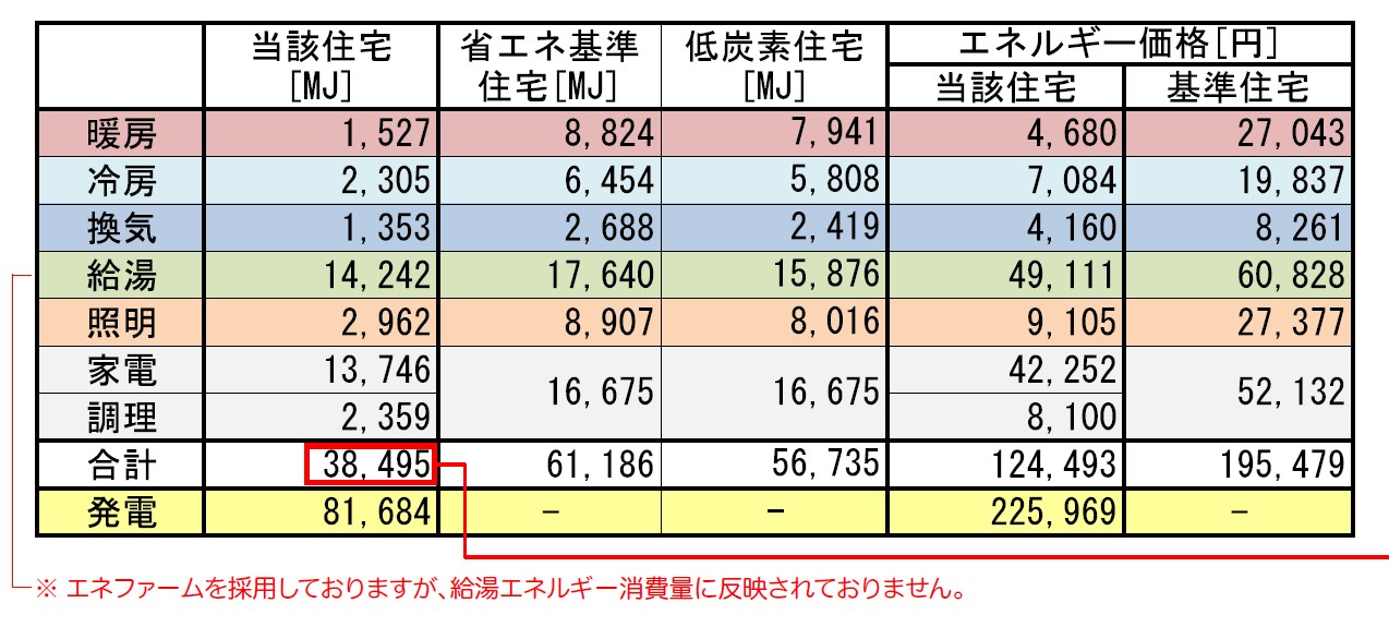 年間の1次エネルギー消費量は38495MJ(メガジュール)です。